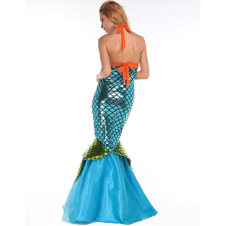 - The top part is orange with a halter – neck design, and the lower part is a blue sequined mermaid tail.