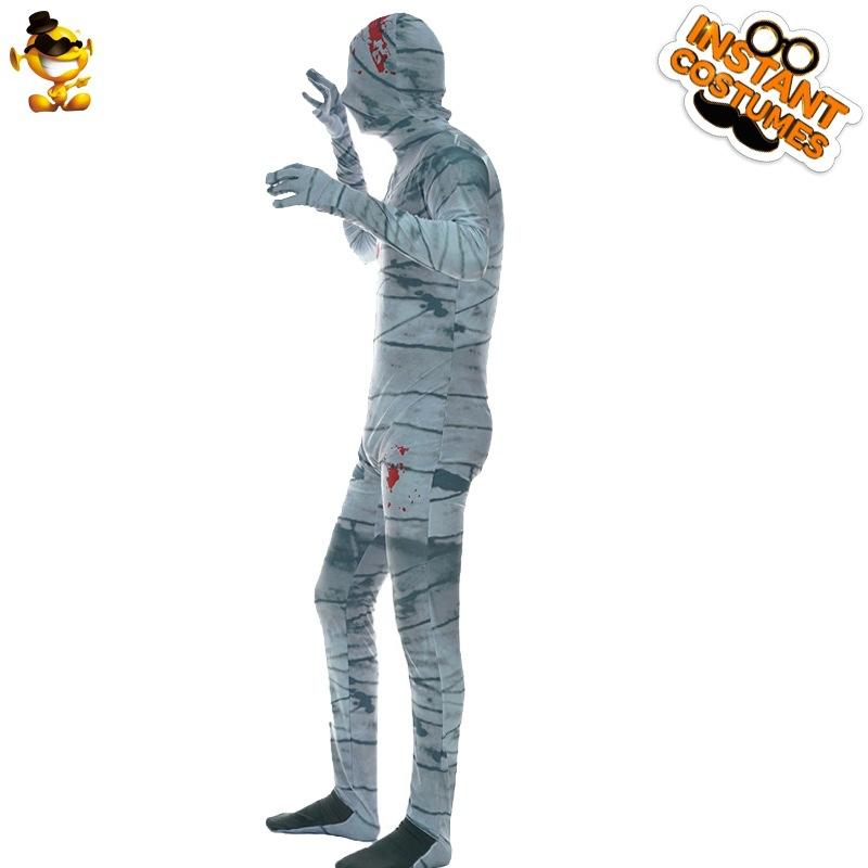 - It is a full – body jumpsuit. It’s designed to look like bandages wrapped around a zombie, with realistic blood – stain and dirt – like splashes all over.