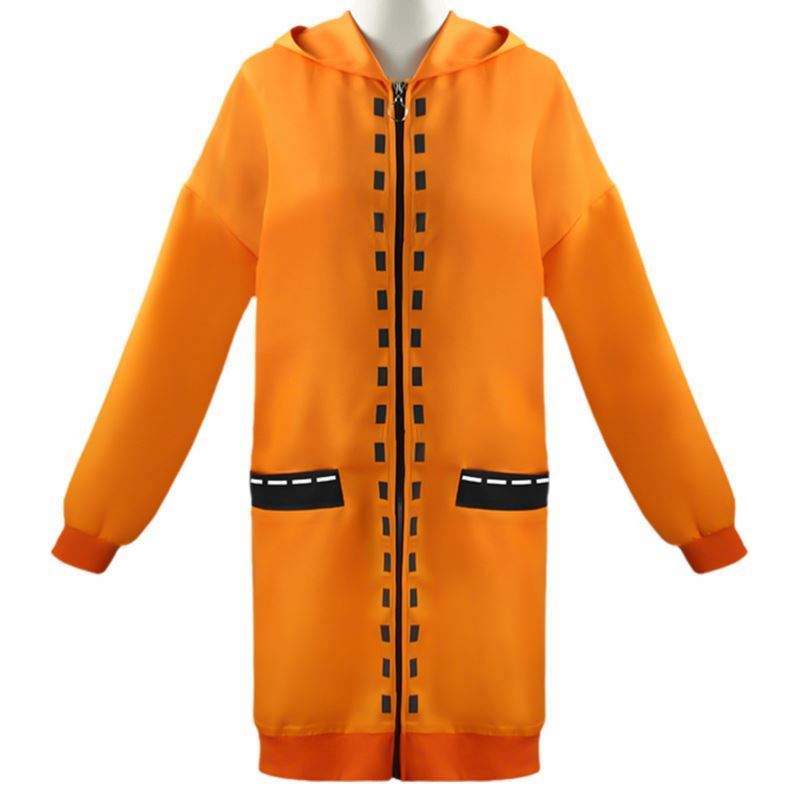 - an orange long – hooded coat with black decorative strips