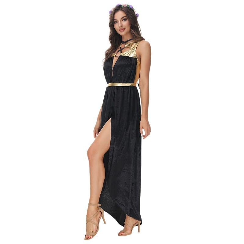 • Includes a long black dress with gold – accented collar and belt, plus a floral crown.