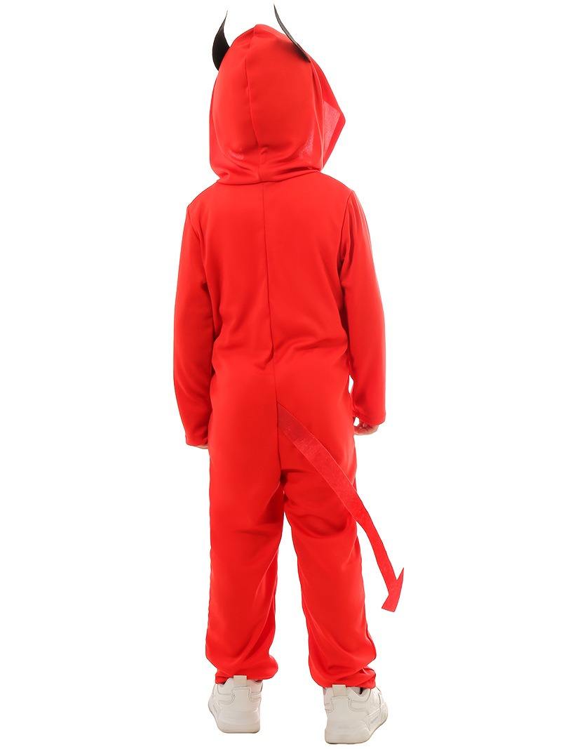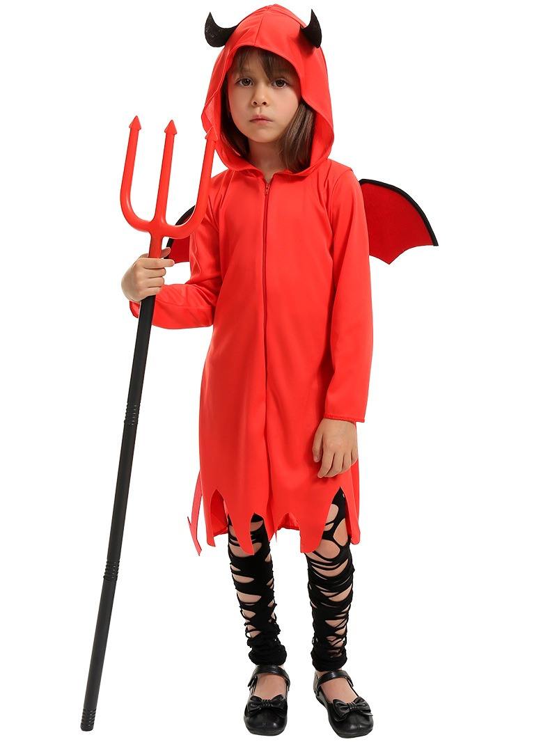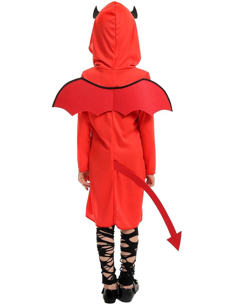 - Includes a red hooded robe with black devil horns on the hood, a red devil tail and black devil wings on the back.