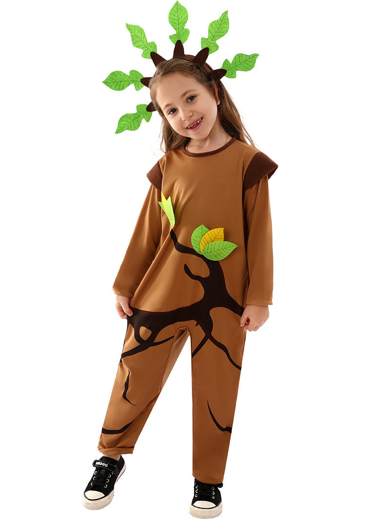 - It includes a brown onesie with patterns of tree branches and colorful leaves printed on it.